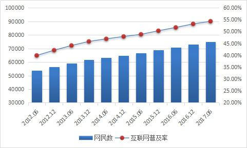 根據(jù)CNNIC最新數(shù)據(jù)顯示,截止2017年6月,我國網(wǎng)民規(guī)模達到7.51億,半年共計新增網(wǎng)民1992萬人?;ヂ?lián)網(wǎng)普及率為54.3%,較2016年底提升1.1個百分點。我國網(wǎng)民規(guī)模增長趨于穩(wěn)定,互聯(lián)網(wǎng)行業(yè)持續(xù)穩(wěn)健發(fā)展,以互聯(lián)網(wǎng)為代表的數(shù)字技術(shù)正在加速與經(jīng)濟社會各領(lǐng)域深度融合,成為促進我國消費升級、經(jīng)濟社會轉(zhuǎn)型、構(gòu)建國家競爭新優(yōu)勢的重要推動力。