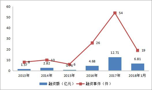 區(qū)塊鏈項(xiàng)目融資從2013年至2016年呈小幅上漲趨勢(shì)。由于2015年的政策監(jiān)管,導(dǎo)致2015年區(qū)塊鏈的投資熱度有所下降,在2017年VC大舉入局,投資額達(dá)12億。2018年1月,區(qū)塊鏈行業(yè)融資額和融資事件已經(jīng)超過(guò)2016年。