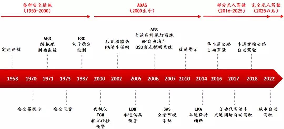 無(wú)人駕駛技術(shù)最初的發(fā)展從減少、防止機(jī)動(dòng)車事故開始。從1950年至2000年,OEM車廠和Tier 1的零部件制造商對(duì)車輛發(fā)明、生產(chǎn)了許多結(jié)構(gòu)性的改進(jìn)。最核心的就是四大安全系統(tǒng):安全帶,防抱死制動(dòng)系統(tǒng)(ABS),安全氣囊和電子穩(wěn)定控制(ESC)。
