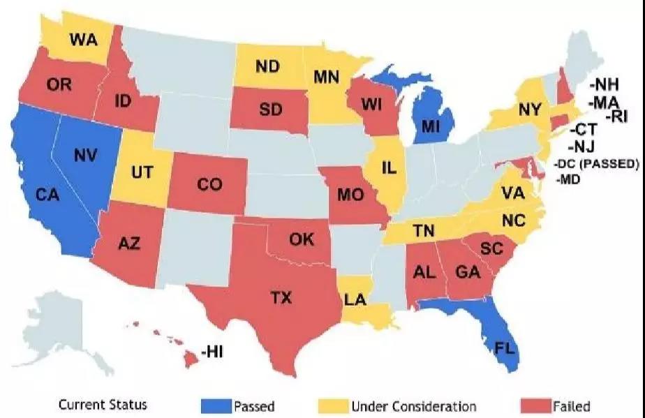 隨著無(wú)人駕駛技術(shù)的不斷發(fā)展演進(jìn),對(duì)無(wú)人駕駛的立法變得十分重要。截至2015年,美國(guó)已經(jīng)有16個(gè)州啟動(dòng)無(wú)人駕駛立法;截至2014 年是12個(gè)州,截至2013年是9個(gè)州,截至2012年是6個(gè)州。Nevada 在2011年授權(quán)無(wú)人駕駛車的運(yùn)營(yíng),是全美第一個(gè)授權(quán)無(wú)人駕駛的州。之后,California,F(xiàn)lorida,Michigan,North Dakota,Tennessee和 Washington D.C 針對(duì)無(wú)人駕駛通過了相關(guān)的法案。Arizona州長(zhǎng)簽署了無(wú)人駕駛的行政命令。