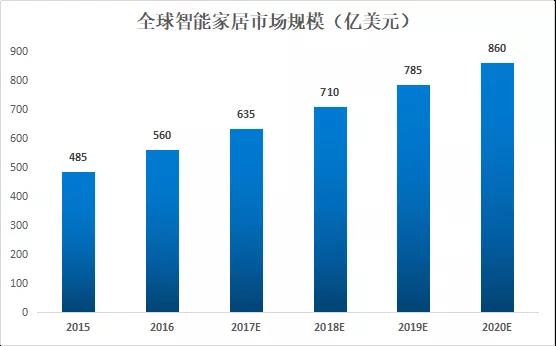 根據(jù)GFK統(tǒng)計,全球智能家居市場規(guī)模在2015年達485億美元,隨后增速逐漸趨緩,預(yù)計仍然維持每年約80億美元的增速。預(yù)計2018年市場規(guī)模將達到710億美元。