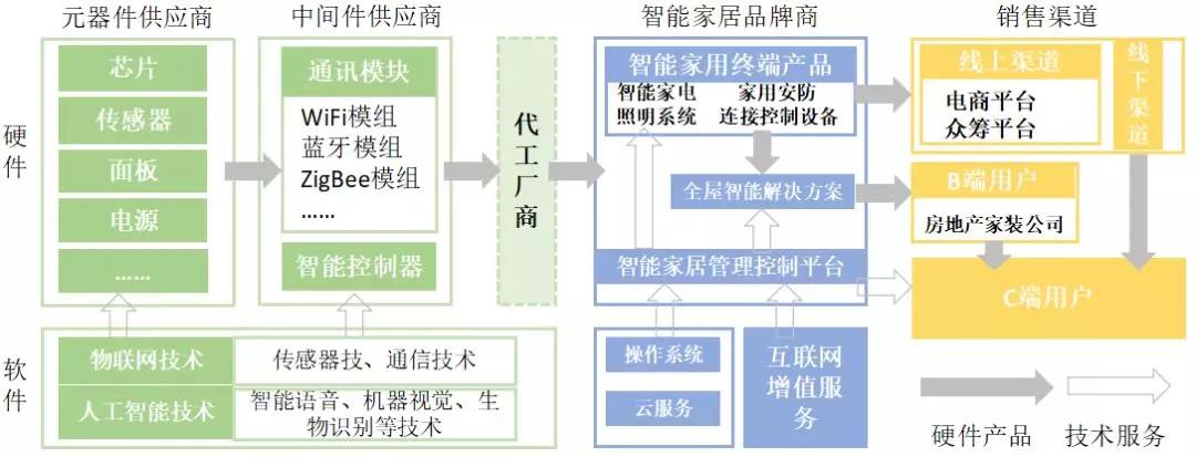 簡單來看,智能家居產(chǎn)業(yè)鏈可以看成由兩部分構(gòu)成,即零部件及技術(shù)支持和智能家居產(chǎn)品。
