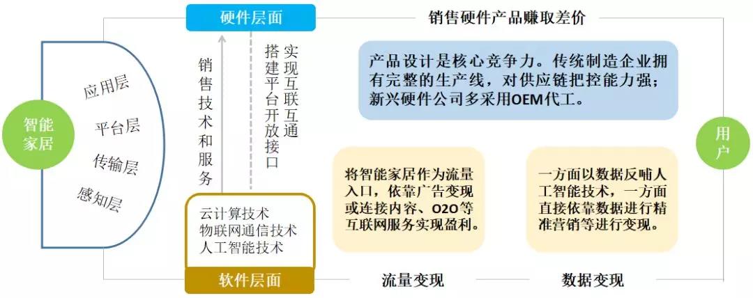 將智能家居劃分為硬件和軟件兩個層面,其中硬件對應(yīng)于智能家居的應(yīng)用層,軟件對于智能家居的平臺層、傳輸層和感知層。硬件產(chǎn)品的品牌方專注于產(chǎn)品側(cè)的設(shè)計和制造,向終端用戶提供的是智能家居的物理屬性,通過銷售硬件賺取差價實現(xiàn)盈利。針對智能家用產(chǎn)品的云計算、物聯(lián)網(wǎng)通信和人工智能三項核心技術(shù),技術(shù)供應(yīng)商通常會提供其中的一項或多項能力。他們既可以選擇直接通過向硬件廠商銷售技術(shù)和服務(wù)變現(xiàn),也可以選擇以硬件產(chǎn)品連接到海量的終端用戶,利用獲取到的用戶流量和數(shù)據(jù),通過面向消費者的互聯(lián)網(wǎng)服務(wù)和面向企業(yè)的數(shù)據(jù)服務(wù)進行變現(xiàn)。