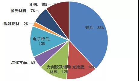 根據(jù) SEMI 統(tǒng)計,2018年全球半導體材料市場為322.3億美元,其中硅片、光掩膜、光刻膠和光刻膠輔助材料、濕化學品、電子特氣、濺射靶材、CMP拋光材料市場分別為121.2、40.4、39.6、16.1、42.7、8、21.7億美元,其中以硅片市場最大,市場占比最高;2018年硅片、光掩膜、光刻膠和光刻膠輔助材料、濕化學品、電子特氣、濺射靶材、拋光材料的市場增速分別為31%,7.7%,6.7%,6.6%,10.3%,6.7%,17.3%,均實現(xiàn)了較高幅度增長。
