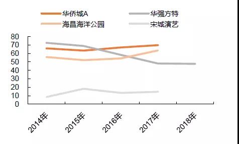 華僑城和海昌海洋公園均有地產(chǎn)開發(fā)業(yè)務(wù),其中華僑城以房地產(chǎn)收入為主,2018年上半年旅游業(yè)務(wù)收入占比32%;海昌海洋公園地產(chǎn)收入占比很低,且近年來聚焦主題公園業(yè)務(wù),地產(chǎn)收入占比明顯下降,從2010年的52%降低到2018年上半年的7%,主題公園營(yíng)運(yùn)收入占比達(dá)93%。