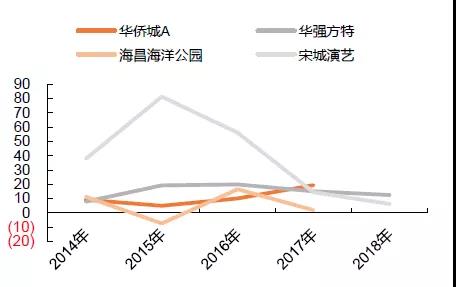 華僑城為我國(guó)第一大主題公園集團(tuán),營(yíng)收和凈利潤(rùn)規(guī)模穩(wěn)居行業(yè)第一,遠(yuǎn)高于其他公司,而且保持快速擴(kuò)張,營(yíng)業(yè)收入和凈利潤(rùn)增速逐年提升。由于有地產(chǎn)業(yè)務(wù),資產(chǎn)負(fù)債率高于行業(yè)平均水平,而且旗下的項(xiàng)目都進(jìn)入成熟期,因此盈利能力較好,ROE維持18%左右,高于其他公司。