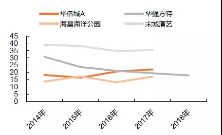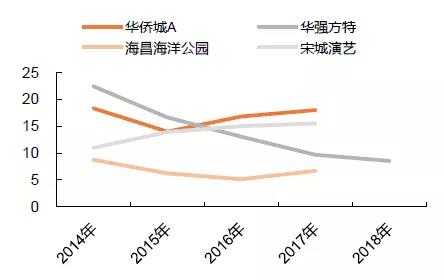 華強(qiáng)方特營(yíng)業(yè)收入近年來穩(wěn)步提升,增速維持在10%以上,但新項(xiàng)目投產(chǎn)初期尚未實(shí)現(xiàn)盈利,歸母凈利潤(rùn)在經(jīng)歷了2014、2015兩年的減少之后,又迎來5%左右的增速。華強(qiáng)方特毛利率高于其他公司,但由于不斷攀升的銷售費(fèi)用,凈利率持續(xù)下降。公司走輕資產(chǎn)化方案,資產(chǎn)負(fù)債率逐年下降。由于華強(qiáng)方特業(yè)務(wù)擴(kuò)張較快,新項(xiàng)目盈利能力不如人意,因此ROE持續(xù)下降。