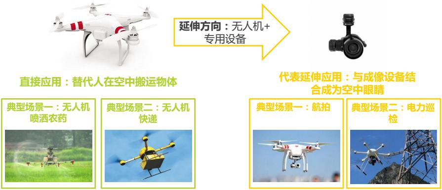 無人機即空中機器人,能夠替代人類完成空中作業(yè),同時與成像設備等部件結合能夠擴展應用場景,實現(xiàn)無人機+。