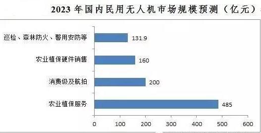 預計到2023年,我國民用無人機各細分應用領域的市場份額分別為:消費級及航拍無人機市場200億元,農(nóng)業(yè)植保硬件銷售160億元,農(nóng)業(yè)植保服務485億元,巡檢、森林防火、警用安防等領域共計131.9億元,合計976.9億元。