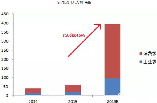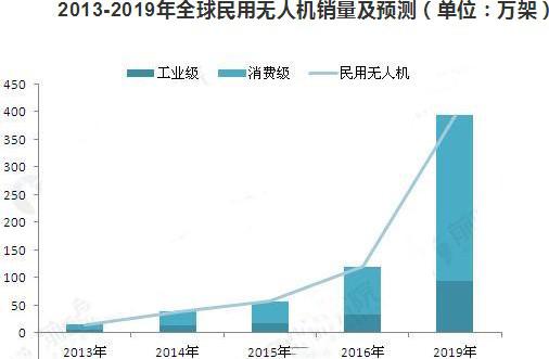 2015年,民用無人機銷量約為56.9萬架,其中,工業(yè)級無人機銷量約為17.1萬架,消費級無人機銷量約為39.8萬架。據(jù)IDC預測,到2019年全球民用無人機銷量預計可達393萬架,其中,消費級約為300萬架,年均復合增長率為60%,工業(yè)級約為93萬架,年均復合增長率為45%。
