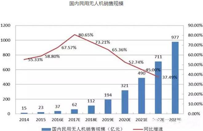 2014年國內(nèi)民用無人機產(chǎn)品銷售規(guī)模15億元,2015年銷售規(guī)模23.3億元,同比增長55.3%。據(jù)IDC數(shù)據(jù)預測,2019年中國民用無人機市場銷售規(guī)模達到390萬臺,合計約600億元。預計到2023年,國內(nèi)民用無人機市場規(guī)模將會達到976.9億元,年復合增長率59%。