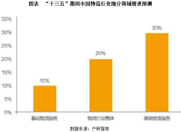 而高端物流服務(wù)增速將可以達(dá)到30%以上的增長。供應(yīng)鏈管理、專業(yè)第三方物流和冷鏈服務(wù)等高端業(yè)態(tài)將迎來快速發(fā)展期,考慮到物流行業(yè)整體增速可以達(dá)到20%以及基礎(chǔ)物流服務(wù)增速僅在10%左右,預(yù)計(jì)“十三五”期間高端物流服務(wù)將可以迎來年均30%左右的持續(xù)增長。