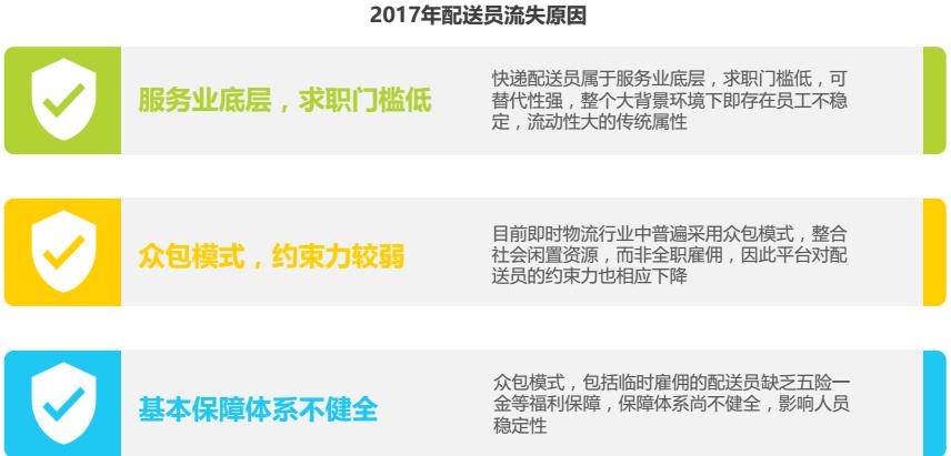 維持穩(wěn)定的配送員團(tuán)隊(duì),對于配送平臺的發(fā)展至關(guān)重要。但目前即時(shí)物流行業(yè)存在配送人員流失率高的難題。究其原因,存在以下三方面的因素:求職門檻低、可替代性強(qiáng),平臺對人員的約束力較弱以及基本保障體系不健全。