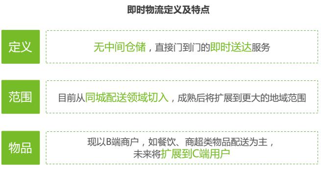 即時(shí)物流在餐飲外賣等行業(yè)有所涉及。2009年,“即時(shí)物流”概念由點(diǎn)我達(dá)創(chuàng)始人趙劍鋒提出。2016年8月,點(diǎn)我達(dá)接受阿里巴巴近10億元投資,“即時(shí)物流”概念廣泛傳播。2016年11月召開的互聯(lián)網(wǎng)大會(huì)上,美團(tuán)點(diǎn)評和餓了么相繼強(qiáng)調(diào)“即時(shí)配送”業(yè)務(wù)。區(qū)別于傳統(tǒng)物流方式,即時(shí)物流的核心特點(diǎn)在于即時(shí)性,滿足用戶提出的極速、準(zhǔn)時(shí)的配送要求。目前,即時(shí)物流以同城、小件領(lǐng)域切入,拓展到生鮮、商超配送領(lǐng)域,再逐步擴(kuò)展到更為廣泛的快遞末端領(lǐng)域。