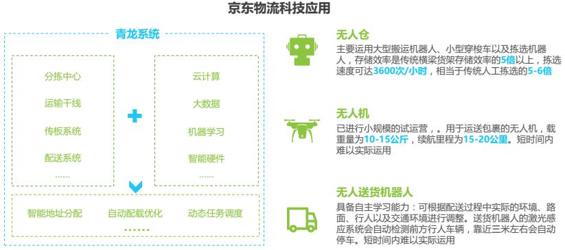 京東于2016年成立了X事業(yè)部,專注智慧物流相關(guān)技術(shù)的研發(fā)。2017年4月京東物流宣布獨(dú)立運(yùn)營,成立物流子公司。截止2017年6月,京東在全國范圍內(nèi)擁有256個(gè)大型倉庫,6906個(gè)配送站和自提點(diǎn),包括已經(jīng)運(yùn)營了7個(gè)大型智能化物流中心“亞洲一號”。目前京東自營配送覆蓋了全國98%的人口,壓縮商品流通成本70%,提升物流運(yùn)營效率2倍以上。京東物流科技的應(yīng)用主要包括兩個(gè)方面,一是基于大數(shù)據(jù)預(yù)測分析技術(shù)實(shí)現(xiàn)智能化的調(diào)度、決策;二是采用一些更自動(dòng)化、智能化的設(shè)備提升物流效率,最終提升客戶的體驗(yàn)。