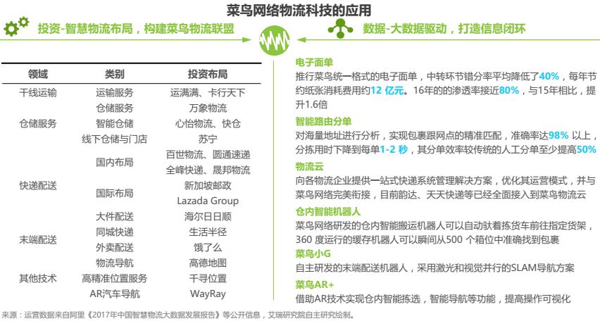 菜鳥網(wǎng)絡(luò)成立于2013年5月,定位于以數(shù)據(jù)驅(qū)動(dòng)、社會(huì)化協(xié)同的物流及供應(yīng)鏈平臺。主要業(yè)務(wù)有倉配網(wǎng)絡(luò)、跨境網(wǎng)絡(luò)、快遞平臺和ET.物流實(shí)驗(yàn)室,以覆蓋全國的倉配網(wǎng)絡(luò)和大數(shù)據(jù)決策平臺為基礎(chǔ),構(gòu)建專業(yè)高效的供應(yīng)鏈服務(wù)。為了提高網(wǎng)絡(luò)效率,一方面菜鳥以投資參股的形式構(gòu)建菜鳥聯(lián)盟,另一方面加大科技研發(fā)的投入,積極布局智慧物流。