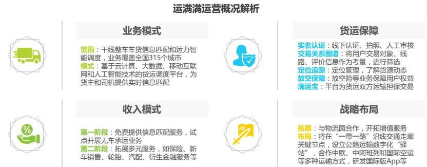 運(yùn)滿滿成立于2013年,是基于云計(jì)算、大數(shù)據(jù)、移動(dòng)互聯(lián)網(wǎng)和人工智能技術(shù)開發(fā)的貨運(yùn)調(diào)度平臺,為貨主和司機(jī)提供實(shí)時(shí)信息匹配,減少貨運(yùn)空載率、提高物流運(yùn)行效率。由于模式相近,運(yùn)滿滿被業(yè)界稱為“貨運(yùn)版的滴滴”,成立3年來共獲得7輪融資,目前估值超過10億美金。截止2017年9月底,平臺實(shí)名注冊重卡司機(jī)400余萬、貨主100余萬,業(yè)務(wù)覆蓋全國 315 個(gè)城市。運(yùn)滿滿最新推出擔(dān)保交易產(chǎn)品“滿運(yùn)寶”,為貨運(yùn)雙方提供運(yùn)費(fèi)擔(dān)保。此外,運(yùn)滿滿還與阿里云、菜鳥、螞蟻金服、平安保險(xiǎn)、中國聯(lián)通、中國重汽等開展深度戰(zhàn)略合作,通過跨界融合,不斷推出創(chuàng)新產(chǎn)品和服務(wù)。未來,運(yùn)滿滿將借助人工智能、無人駕駛、區(qū)塊鏈等技術(shù)驅(qū)動(dòng),提供貫穿全產(chǎn)業(yè)鏈的線上線下服務(wù),構(gòu)建公路物流生態(tài)圈,打造綜合性的貨運(yùn)平臺。