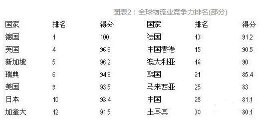 國家的物流業(yè)總體競爭力不僅取決于基礎(chǔ)設(shè)施建設(shè)水平,還取決于整個(gè)物流產(chǎn)業(yè)的管理水平、第三方物流企業(yè)發(fā)展水平和第四方物流企業(yè)的整合能力。從國家層面來看,世界銀行發(fā)布的報(bào)告顯示,在全球物流業(yè)競爭力排行榜(Logistics Performance Index)中,歐洲國家表現(xiàn)最為突出,前20名中超過60%的企業(yè)來自歐洲,亞洲物流業(yè)競爭力最強(qiáng)的國家/地區(qū)是日本(排名第十),其次為中國香港和臺灣地區(qū),中國大陸在全球僅排名第28??傮w而言,發(fā)展中國家在基礎(chǔ)設(shè)施、國際運(yùn)輸、物流能力、交貨及時(shí)性等方面還與歐美等發(fā)達(dá)國家存在較大的差距,物流業(yè)的全球競爭能力還十分有限。