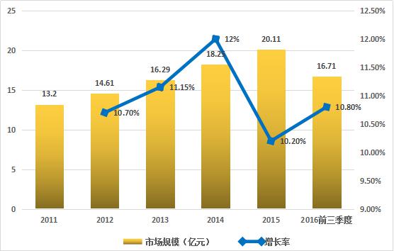 受下游需求市場(chǎng)不斷擴(kuò)大的影響,近幾年中國(guó)α-亞麻酸行業(yè)市場(chǎng)處于快速增長(zhǎng)期,2011-2016年前三季度中國(guó)α-亞麻酸(80%以上)行業(yè)市場(chǎng)規(guī)模增長(zhǎng)率在10%-13%之間。其中,2014年中國(guó)α-亞麻酸(80%以上)行業(yè)市場(chǎng)規(guī)模18.25億元,2015年中國(guó)α-亞麻酸(80%以上)行業(yè)市場(chǎng)規(guī)模20.11億元,同比增長(zhǎng)10.2%,行業(yè)市場(chǎng)發(fā)展情況較好。