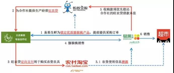 例如:天貓超市的供貨電商易果生鮮與陜西周至縣北吉果蔬專業(yè)合作社簽訂采購協(xié)議。螞蟻金服基于采購訂單,在對訂單進行識別并確認(rèn)后,由網(wǎng)商銀行為合作社數(shù)百名果農(nóng)社員提供低息貸款,果農(nóng)拿到這筆貸款后,通過定向支付工具專項用于從農(nóng)村淘寶購買指定的農(nóng)藥、農(nóng)資、農(nóng)具。最后果品通過易果生鮮進駐天貓超市進行銷售。這種基于產(chǎn)業(yè)鏈形成的閉環(huán)信貸模式,突破了商業(yè)銀行傳統(tǒng)的評級授信要求,也無須另行提供抵押、質(zhì)押、擔(dān)保,提供的資金效率高、環(huán)節(jié)更簡單,利率則遠(yuǎn)低于民間借貸。