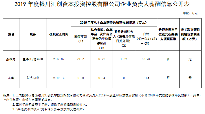 按照《銀川市屬國有企業(yè)負責人薪酬管理辦法(試行)》(銀國資發(fā)〔2021〕458號)規(guī)定,經(jīng)銀川市國資委核定,現(xiàn)將銀川匯創(chuàng)資本投資控股有限公司企業(yè)負責人2019年度薪酬信息予以披露。